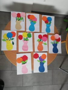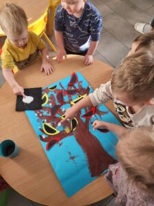 Podczas zajęć dzieci malują, rysują, lepią, wyklejają i tworzą prace z różnorodnych, bezpiecznych materiałów. Nie liczy się efekt końcowy, lecz radość tworzenia i możliwość eksperymentowania. Dzieci poznają różne techniki – od malowania palcami, przez stemplowanie i odbijanie, po prace z masą solną czy papierem kolorowym.