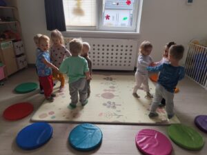 Podczas zajęć dzieci uczestniczą w różnorodnych ćwiczeniach i zabawach: toczą piłki, pokonują tory przeszkód, biegają, skaczą, tańczą i wykonują proste ćwiczenia gimnastyczne z wykorzystaniem bezpiecznych przyborów. Ruch odbywa się w formie zabawy, dostosowanej do wieku i możliwości dzieci.